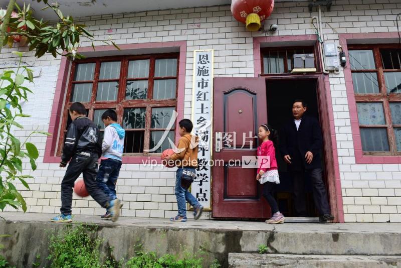 5月22日,湖北省恩施土家族苗族自治州恩施市红土乡大岩村,文德高和四个学生在教学点上。