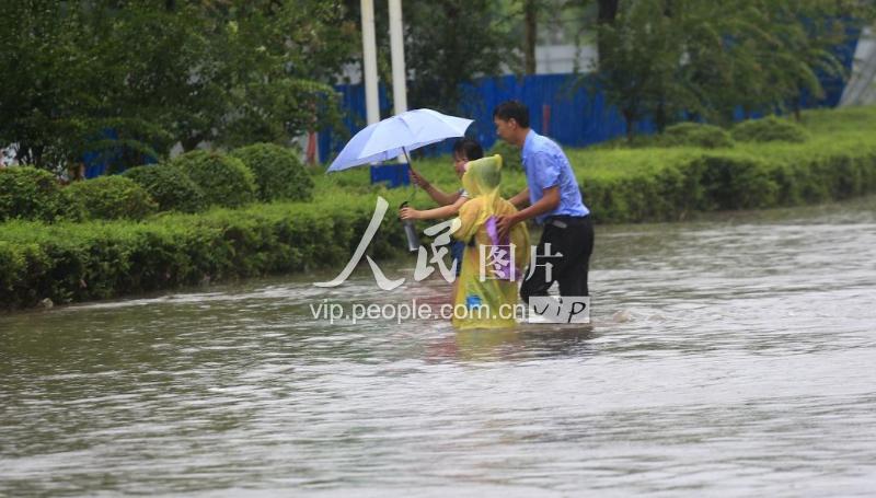 2018年8月18日,“活雷锋拦车哥”王鑫正在冒雨帮助小学生安全过“河”。