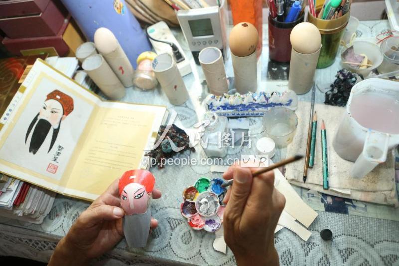 2018年8月18日,上海,费永泉制作蛋壳画。