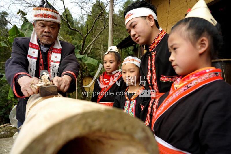 2019年1月30日,在国家级非物质文化遗产“黄泥鼓舞”传承基地——广西金秀瑶族自治县六巷乡六巷村下古陈屯,老艺人盘振武向几名孩子传授黄泥鼓的制作方法。