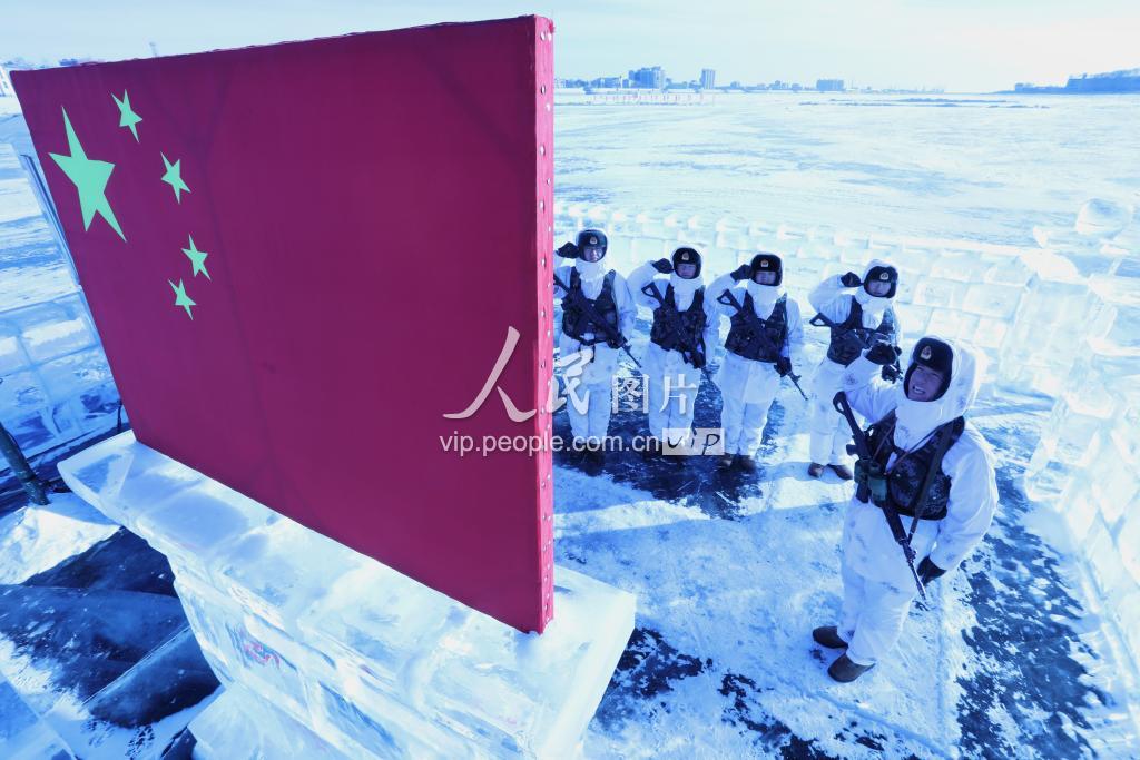 1月31日,“黑河好八连”官兵在巡逻执勤途中,官兵们途径辖区黑河市正面的5号哨位旁,通过向界江“冰哨”上的国旗宣誓,表达官兵们忠于祖国、爱边爱国的忠诚信念。