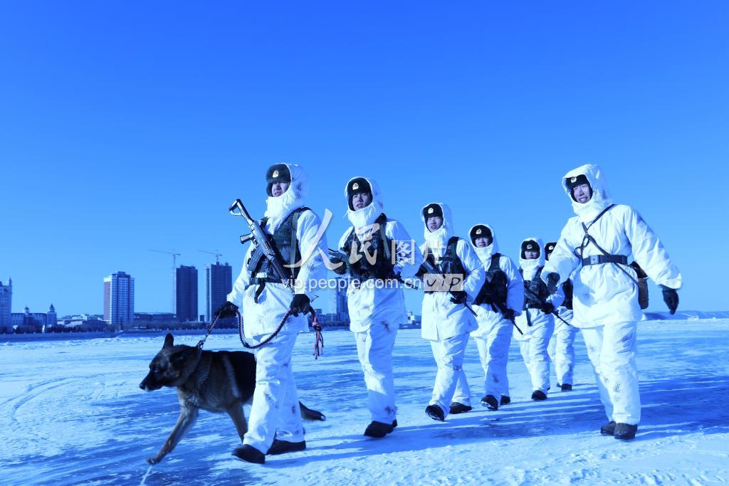 1月31日,北部战区陆军某边防旅“黑河好八连”官兵冒着凛冽的寒风,在中俄界江上巡逻执勤。