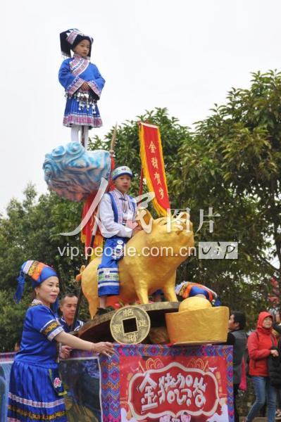 2月11日,广西靖西市一支民间文艺团体展演“金猪贺岁”抬阁造型艺术。