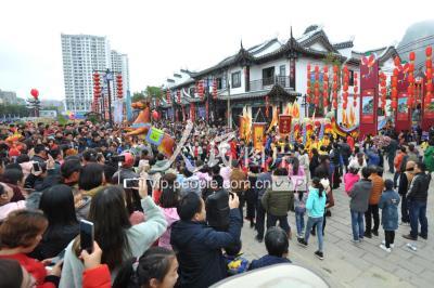 2月11日,在广西靖西市锦绣古镇,众多游客观看民俗巡游展演。