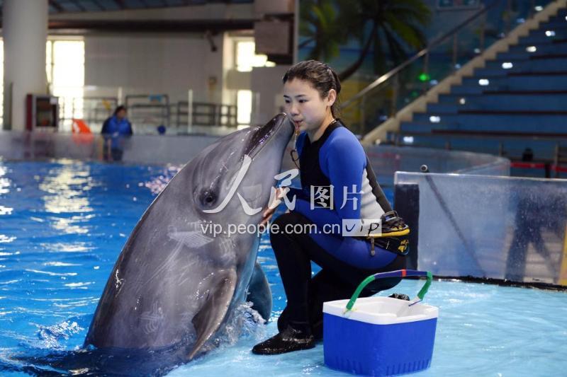 翻滚、跳跃……在蔚蓝深邃的水池里,海豚们在驯兽师的指引下做出各种花巧的表演,它们每一次帅气的现身都会引来一片惊叹声。“台上十分钟,台下十年功”,海洋动物们能学会这些表演技能,离不开驯兽师的付出。 90后的孙丽如是合肥市极地海洋世界的一名女驯兽师,从事驯兽行业的她驯养海豚、海豹已有4年多的时间,对于这一职业来说,女性并不多见。孙丽如说,因为从小就喜欢 动物的缘故,毕业以后就选择了这份工作。在她的眼中,这些海豚只是可爱的小孩子,除了每天陪它们训练表演,她还是这些动物的“保姆”。 “带动物”并不是一件简单的事,不仅需要照顾它们的饮食起居,还需要了解动物心理学、动物行为学等知识。“它们有时也会有‘小脾气’,会做恶作剧、不配合表演,这时候就得像“哄孩子”一样,轻轻亲吻、抚摸。动物的思维单纯、可爱、简单,我喜欢和动物们在一起。”此时一只可爱的海豚将硕大的脑袋探出水面让孙丽如抚摸。 作为一名女驯兽员,每天泡在水中是常态,这对于许多人而言都是极为艰辛的。孙丽如坦言道,“并不会觉得辛苦,我十分地挚爱自己所做的工作。与动物交流也是一种万物平等的心态,你百分百对它好,它就会百分百对你好的。”
