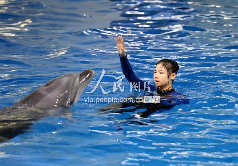 2019年3月4日,安徽省合肥市,驯兽师孙丽如正在与海豚在水中共舞。