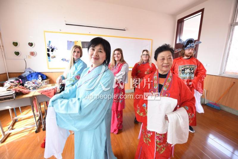 2019年3月27日,江苏省连云港市戏曲非遗传承人正在指导外国语学校向美国ILP留学生(兼外老师)戏剧演示要领。