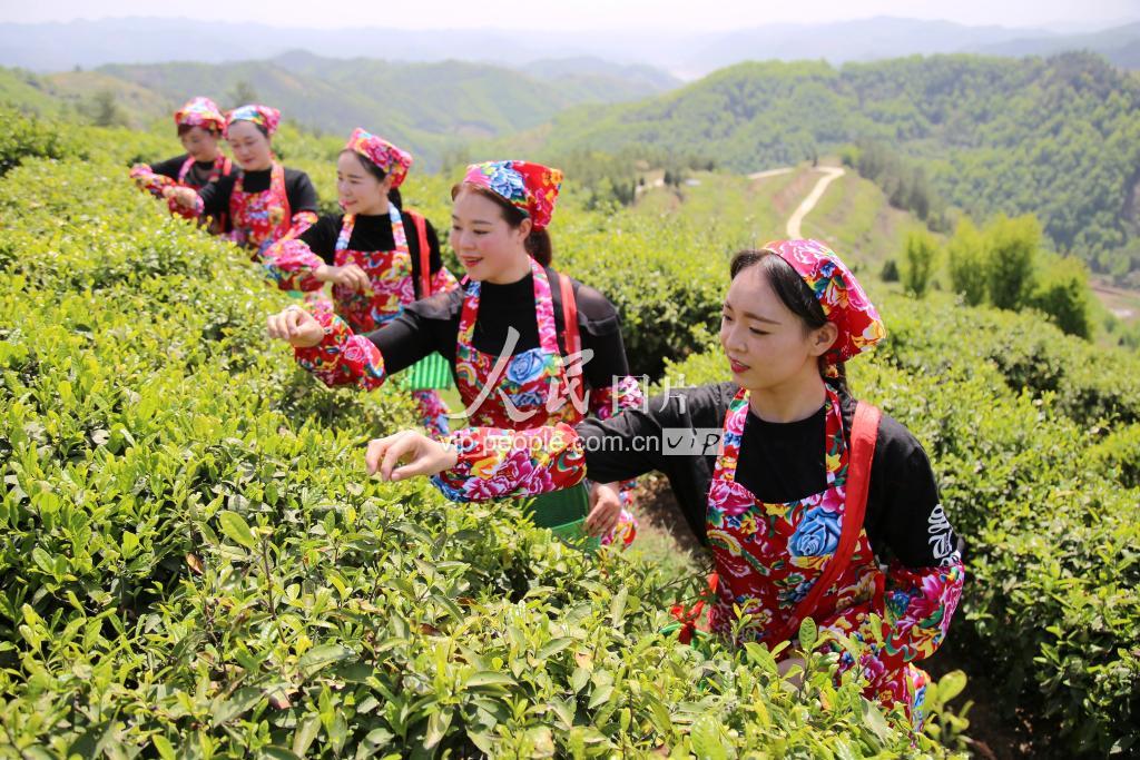 2019年4月16日,采茶女在湖北省十堰市郧阳区青山镇周家河村茶园里体验春茶采摘。