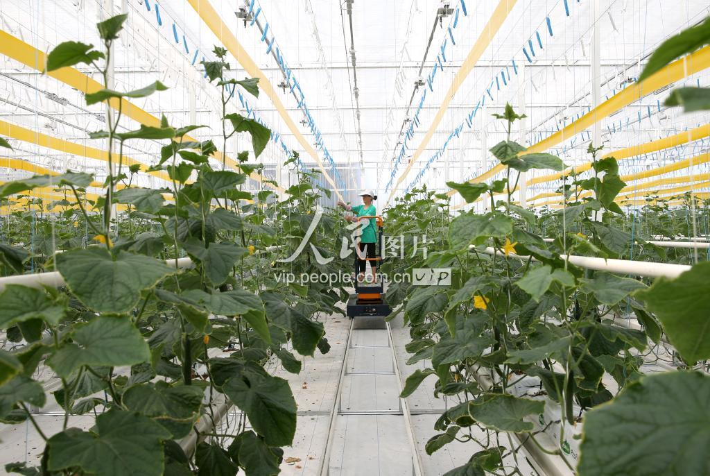 2019年4月26日,四川省眉山市岷江现代农业示范园区东坡片区的“西南智慧农业项目” 现场,工作人员正在采摘无土栽培的黄瓜。