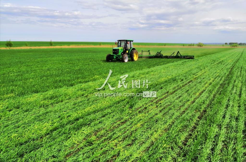 2019年5月27日,黑龙江垦区五大连池农场一台大马力机车正在为小麦压青苗作业。