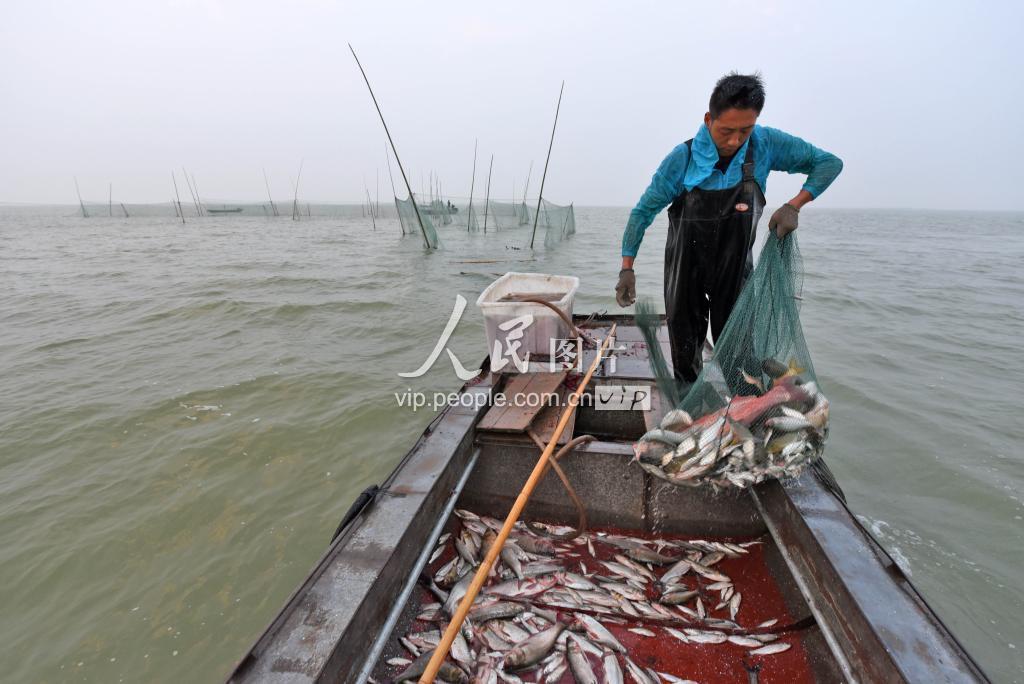 2019年7月1日凌晨时分,江苏省宿迁市骆马湖,渔民在湖区开展捕捞作业。骆马湖结束了为期5个月的禁渔期,平静多月的湖面又热闹起来。