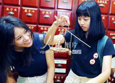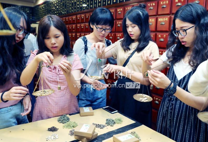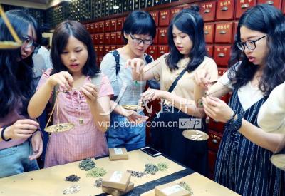 2019年7月21日,台湾大学生们正在“李良济”国医馆戥称中草药,制作驱蚊香包。