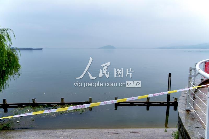 2019年7月21日,星子县城鄱阳湖大堤的观景人行道已被洪水淹没拉起了警戒线。