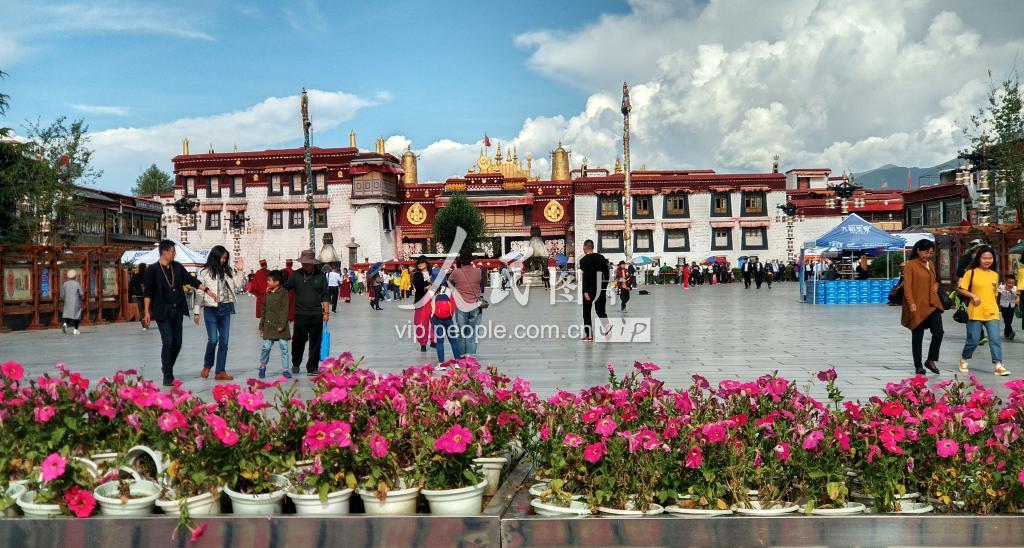 2019年8月15日,游人在西藏拉萨大昭寺旅游观光。