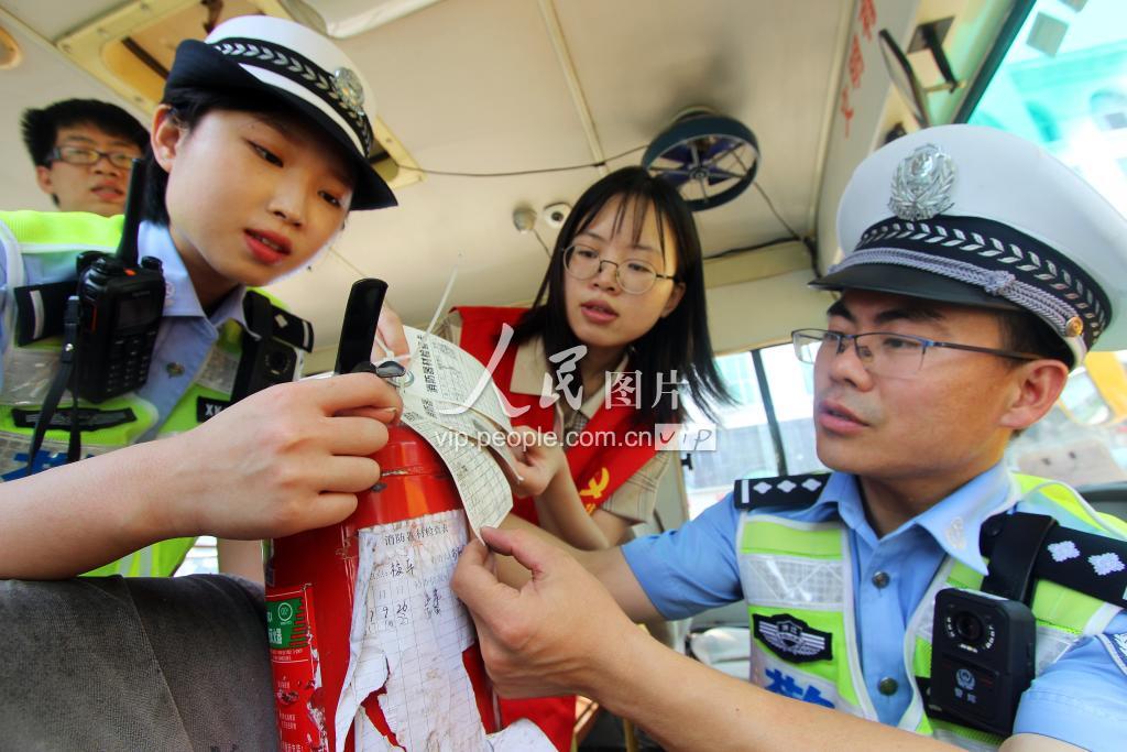 图片说明: 交警和党员干部正在当地蓝天学校对校车进行安全隐患检查。