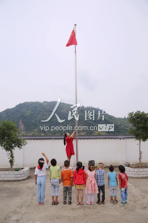 2019年9月1日,在湖北省十堰市郧阳区五峰乡东峰村教学点,教师王婧组织学生参加升旗仪式。