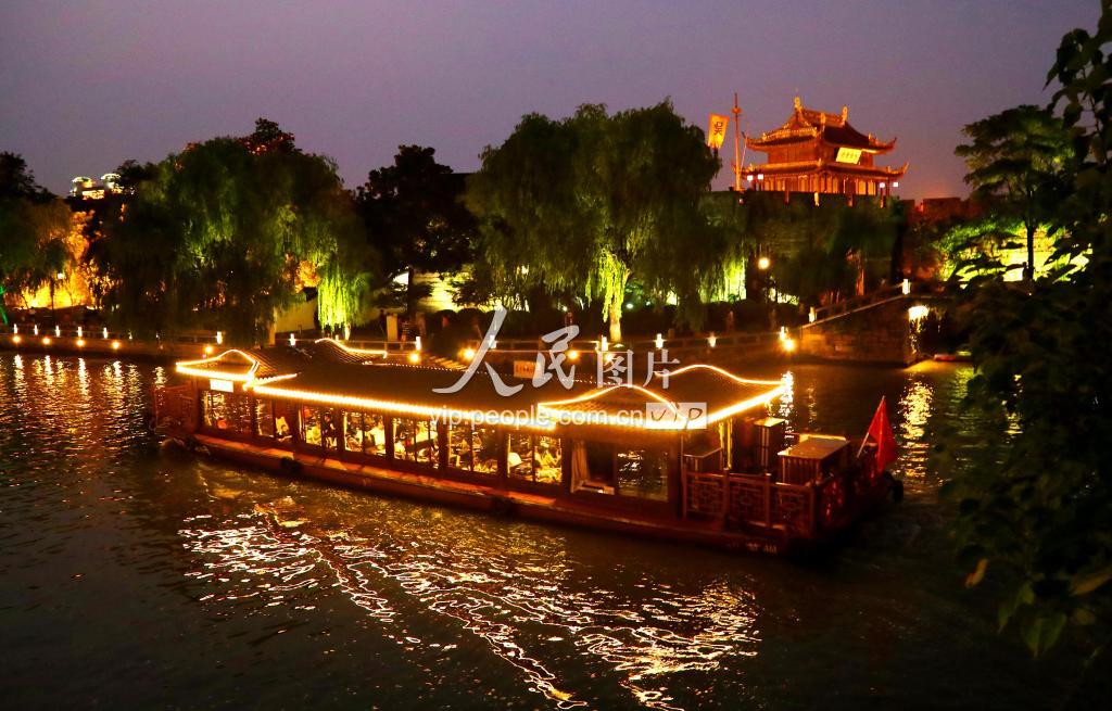 9月8日,人们乘坐仿古游船在璀璨迷人的苏州环城河上秋夜赏景。
