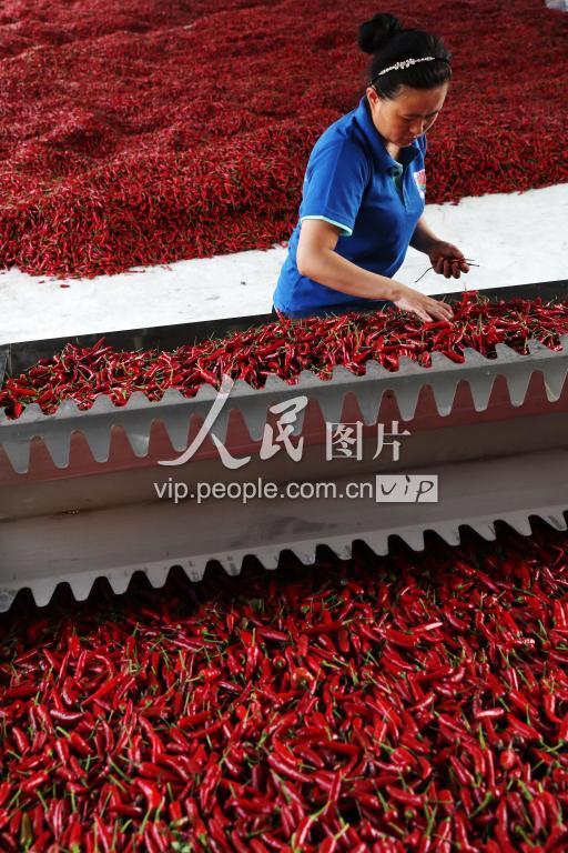 9月11日,女工在重庆市黔江区鹅池镇朵宇农业发展公司辣椒加工车间分拣准备烘烤的辣椒。