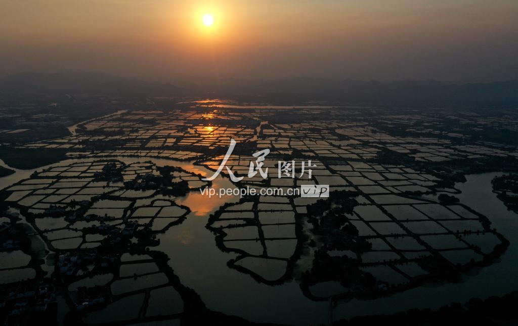 2019年9月17日,航拍夕阳下荻港村的桑基鱼塘,呈现出水乡独特的美景。