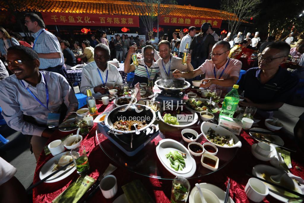 2019年9月16日,国际友人和当地村民一同品尝鱼汤饭,感受丰收的喜悦。