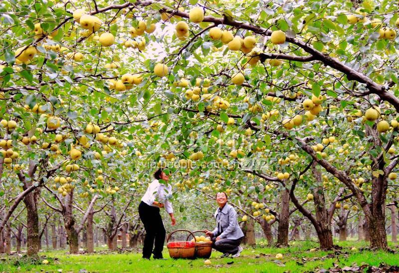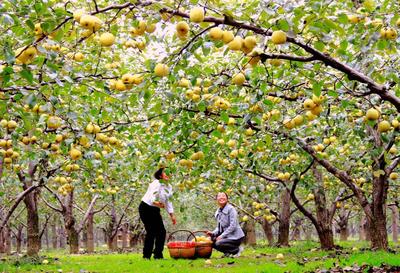 2019年9月18日,金秋送爽,河南省宁陵石桥镇万亩梨园内,黄澄澄的金顶谢花酥梨压弯枝头,农民树上树下采梨忙,一派丰收节景象。 宁陵县是中国酥梨之乡,宁陵金顶谢花酥梨至今已有700多年的栽培历史,以其酥脆易溶、汁多味甜,上乘的品质多次荣获国家、部、省优质农产品金奖。金顶谢花酥梨,是因为梨蒂周围生有一层黄色果锈,果实不经后熟,谢花即酥脆可口,故而得名。目前,酥梨种植面积22万亩,年产酥梨10亿斤,梨农年均收入超万元。