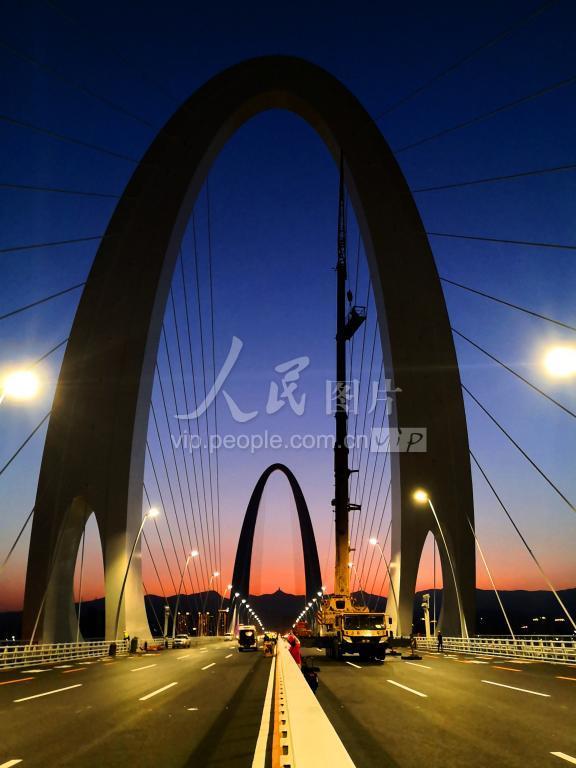 9月24日,傍晚,跨越北京莲石湖上的新首钢大桥,正在进行最后的收尾工作。