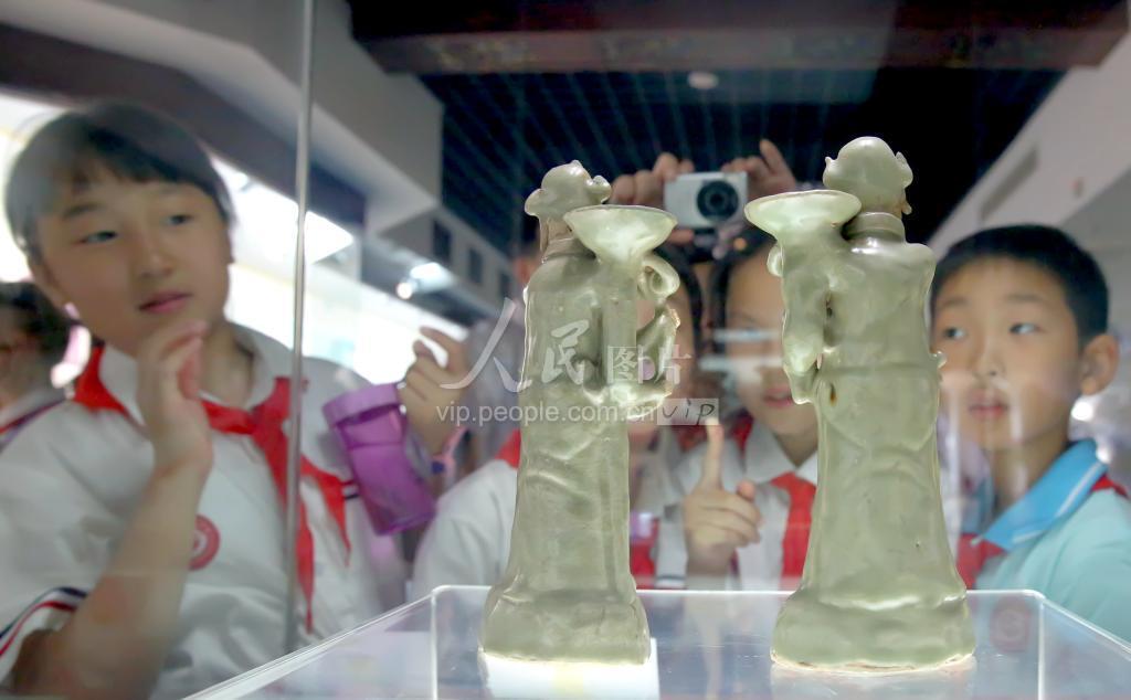 9月25日,在安徽中国黄梅戏博物馆,安庆市公园小学戏曲兴趣班的小朋友正在观赏元代青釉人物灯。