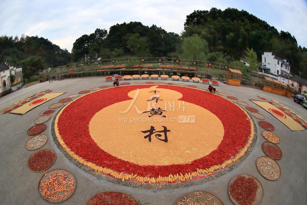 2019年9月26日,村民在黄山市休宁县商山镇黄村古村晒场上翻晒农作物。 金秋时节,在安徽黄山市休宁县商山镇黄村千年古村又迎来了一个丰收年,村民们抢抓晴好天气,将收获的红辣椒、玉米、南瓜、稻谷、黑豆和菊花等五颜六色的农作物,用圆圆的竹匾,错落有致地摆拼出一幅巨大葫芦晒秋图案,在阳光照射下,格外显得耀眼夺目,其场景颇为壮观。