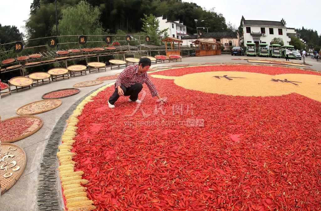 2019年9月26日,村民在黄山市休宁县商山镇黄村古村晒场上翻晒农作物。 金秋时节,在安徽黄山市休宁县商山镇黄村千年古村又迎来了一个丰收年,村民们抢抓晴好天气,将收获的红辣椒、玉米、南瓜、稻谷、黑豆和菊花等五颜六色的农作物,用圆圆的竹匾,错落有致地摆拼出一幅巨大葫芦晒秋图案,在阳光照射下,格外显得耀眼夺目,其场景颇为壮观。