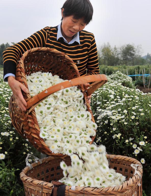 2019年10月13日,安徽省黄山市休宁县海阳镇盐铺村农民在菊园采摘“徽州贡菊” 。