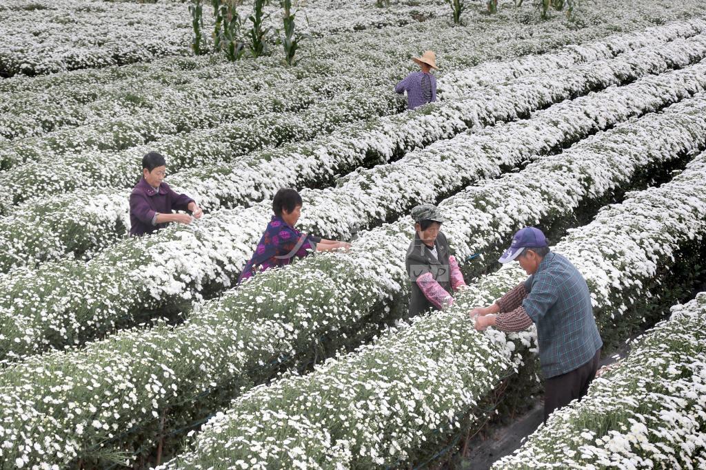 “寒露”过后,“霜降”将至。连日来,受寒潮阴雨降温天气影响,被誉为“中国四大名菊”之一的安徽省黄山市休宁县海阳镇盐铺村的2600亩徽州贡菊正进入盛采季,村民们抢抓时节,加紧采收,力争在“霜降”节气之前采收归仓,确保不受霜冻损失。
