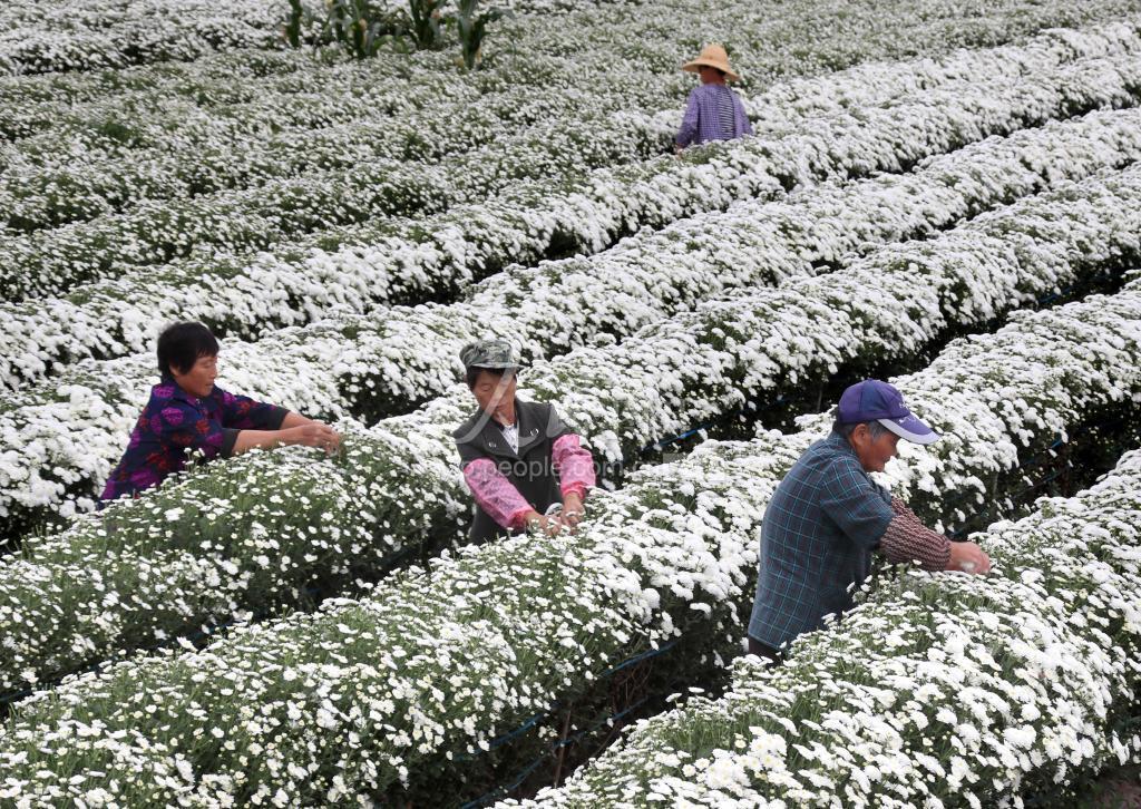 2019年10月13日,安徽省黄山市休宁县海阳镇盐铺村农民在菊园采摘“徽州贡菊” 。