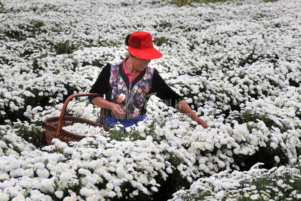 2019年10月13日,安徽省黄山市休宁县海阳镇盐铺村农民在菊园采摘“徽州贡菊” 。