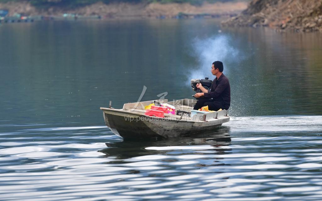 10月14日,在广西柳州市融安县长安镇安宁村泗维河,刘文香驾驶小船去渔排上喂鱼。