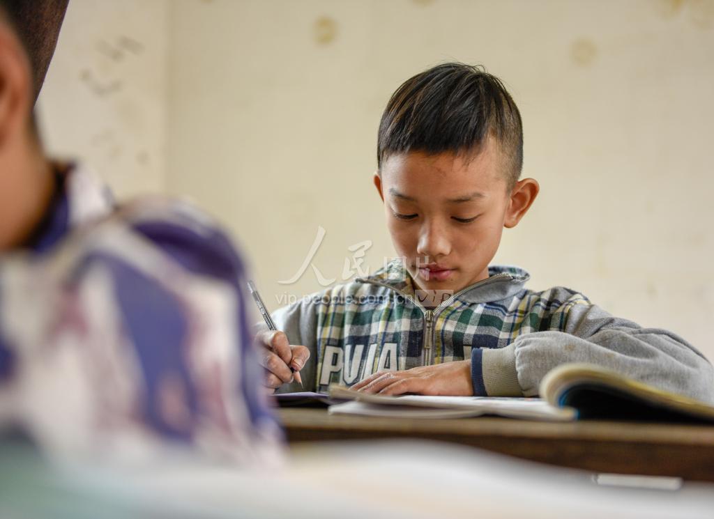 2019年10月16日,湖南省道县乐福堂倒江源小学,学生在专心做作业。