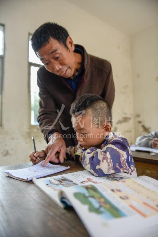 2019年10月16日,湖南省道县乐福堂倒江源小学,魏载松正在给学生辅导作业。
