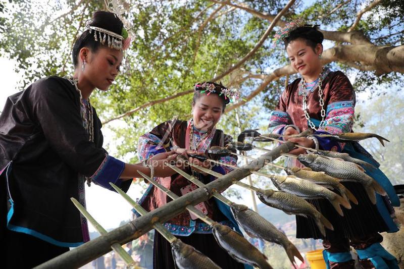 10月18日,广西柳州市融水苗族自治县洞头镇举办的石头鱼美食节上,几名侗族姑娘用特制的竹签串禾花鲤。