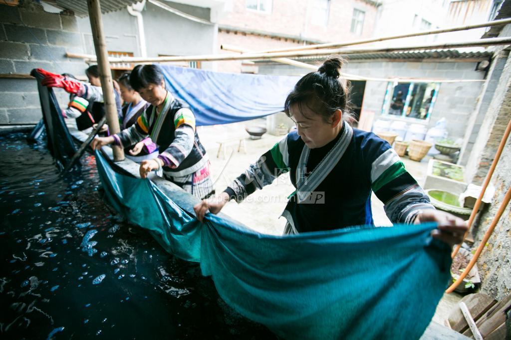 10月22日,在贵州省毕节市织金县珠藏镇链子村,杨晓珍(右一)正在染布。