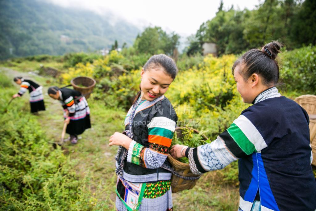 10月22日,在贵州省毕节市织金县珠藏镇链子村,杨晓珍正在和村民一起采摘染料植物。