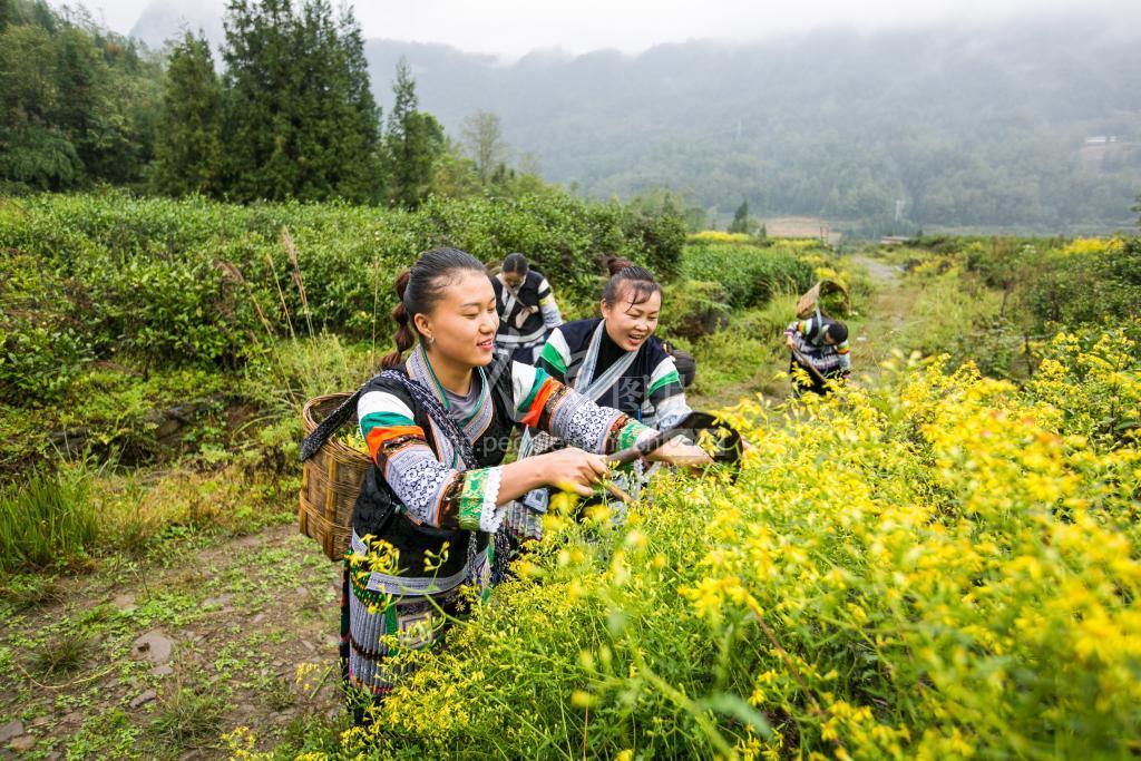10月22日,在贵州省毕节市织金县珠藏镇链子村,杨晓珍正在和村民一起采摘染料植物。