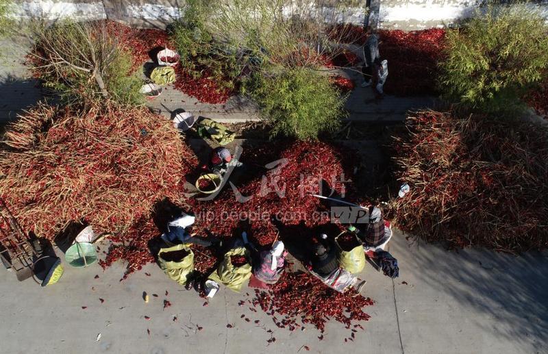 10月27日,内蒙古通辽市开鲁县东风镇道德村椒农在收获红干椒。