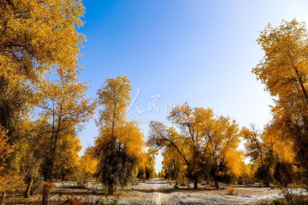 2019年10月25日,新疆沙雅县沙雁洲景区一景。铮铮铁骨千年铸,不屈品质万年颂。人们都说,胡杨“生而千年不死,死而千年不倒,倒而千年不朽”。