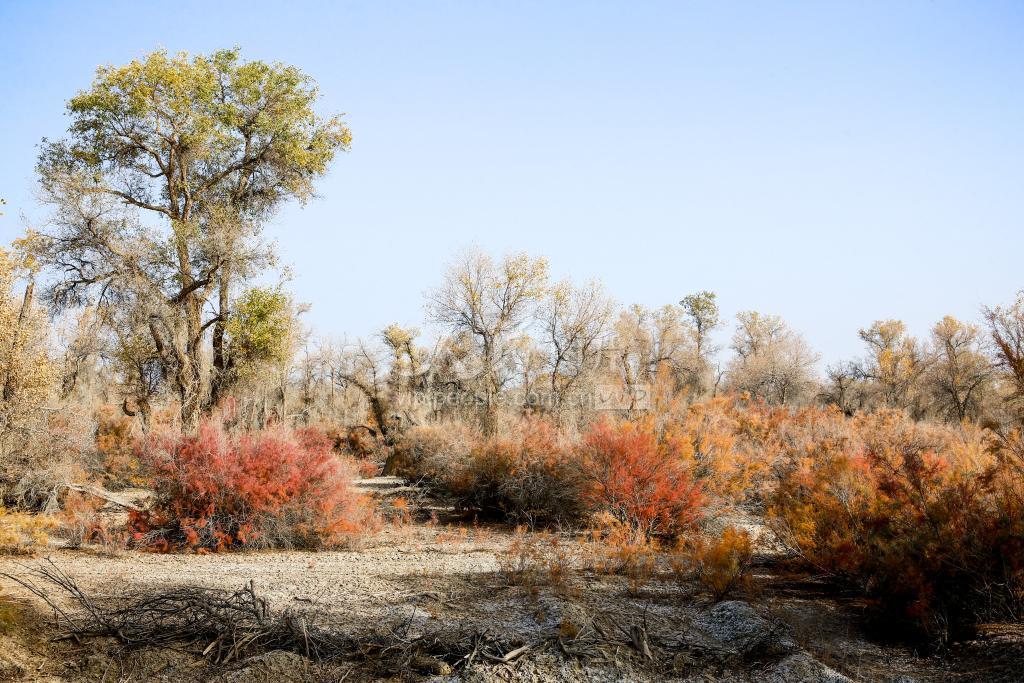 2019年10月25日,新疆沙雅县沙雁洲景区内,红柳和胡杨交错丛生,它们是天生的“兄弟”。