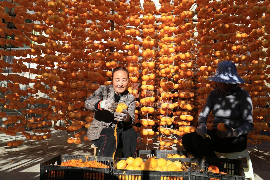 2019年10月28日,甘肃陇南市武都区石门镇群众正用传统方式挂晒加工柿饼,实现柿子增值农民增收。