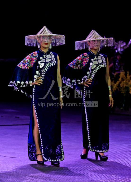 10月28日晚,在湖南省凤凰县,一支代表队在进行苗族服饰银饰秀展示。