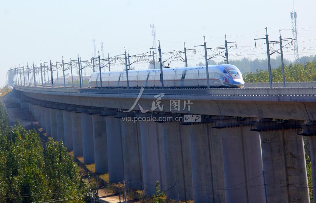 10月30日,一辆试运行的动车在鲁南高铁日照至曲阜段区间驰骋。