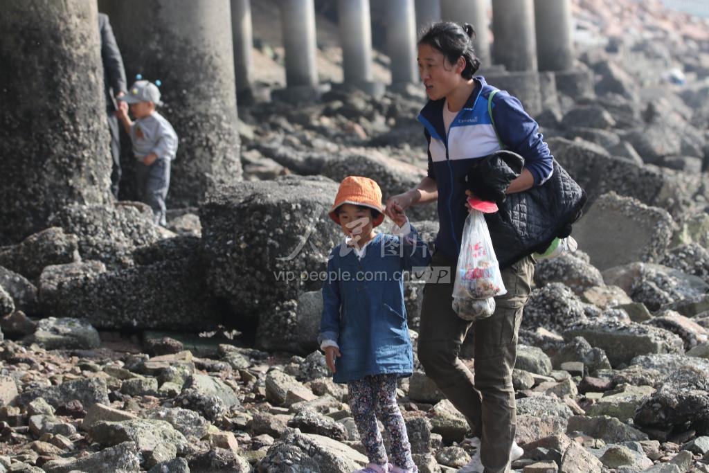 2019年10月31日,市民在青岛胶州湾沧口海滩赶海。
