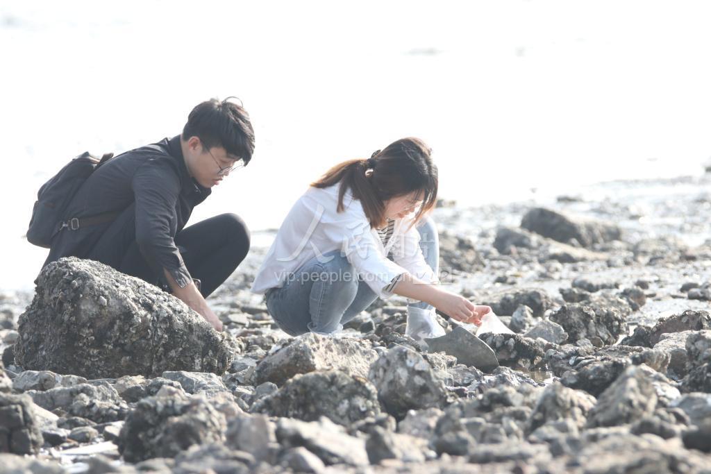 2019年10月31日,市民在青岛胶州湾沧口海滩赶海。