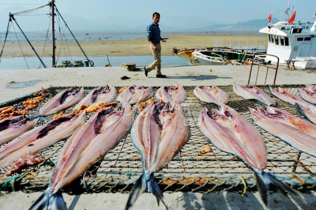 2019年10月31日,金秋时节气候干爽,山东青岛崂山区港东渔村进入鱼干晾晒季,渔民开始挑选各种海鱼,制作出不同盐度的风味鱼干,成为海边一道独特的风景。