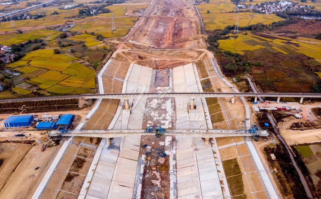 2019年10月31日,安徽省合肥市庐江县柯坦镇境内的引江济淮工程庐江试验段主体基本完工,一列火车正在通过铁路桥,河道雄姿初现。